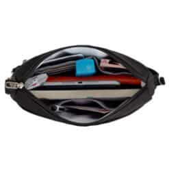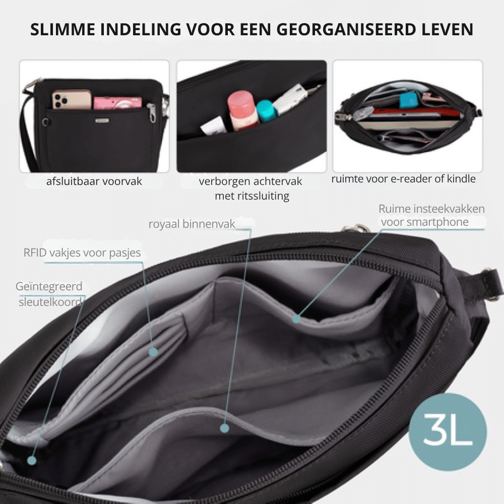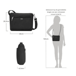 Snijbestendige riemen: Net als het materiaal van de tas, zijn ook de draagriemen versterkt met een interne, stalen kabel. Dit beschermt je tegen dieven die proberen de riem door te snijden om de tas van je schouder te stelen. Zo blijft je tas altijd veilig aan je lichaam, zelfs in een drukke menigte.