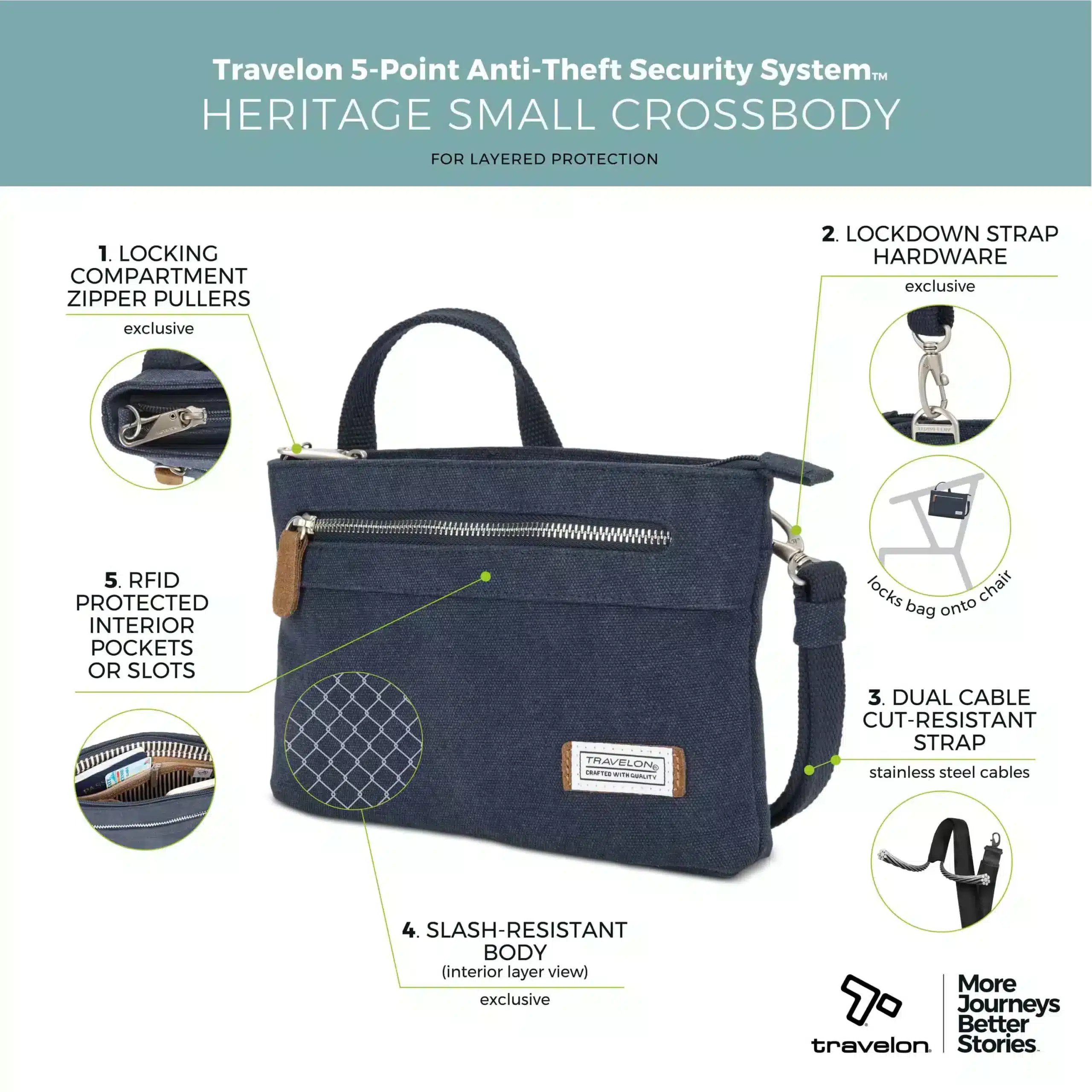 Veiligheid is een topprioriteit, en de Travelon Heritage Clutch stelt hierin niet teleur. Net als alle Travelon anti-diefstal tassen, is ook deze compacte clutch uitgerust met het beproefde 5-Point Anti-Theft™ beveiligingssysteem. Dit betekent dat je, ondanks het bescheiden formaat, kunt genieten van een ongekende gemoedsrust. Je waardevolle spullen zijn optimaal beschermd dankzij de volgende kenmerken: